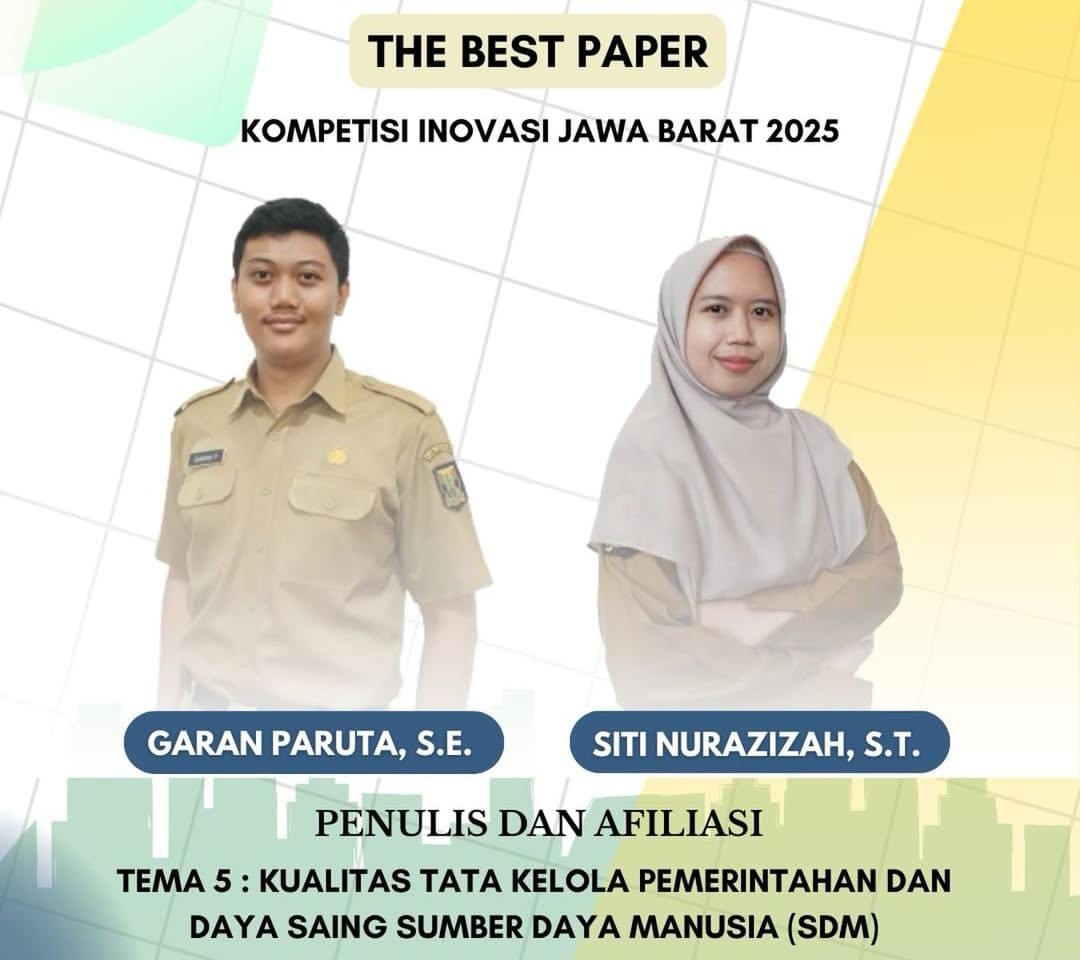 ARAHBICARA.COM – Prestasi membanggakan diraih Badan Perencanaan Pembangunan, Penelitian dan Pengembangan Daerah (Bappelitbangda) Kabupaten Sukabumi dalam ajang Kompetisi Inovasi Jawa Barat 2025. Dua aparatur muda Bappelitbangda, yakni Garan Paruta, S.E. dan Siti Nurazizah, S.T., berhasil meraih penghargaan The Best Paper pada kategori Tema 5: Kualitas Tata Kelola Pemerintahan dan Daya Saing Sumber Daya Manusia (SDM).