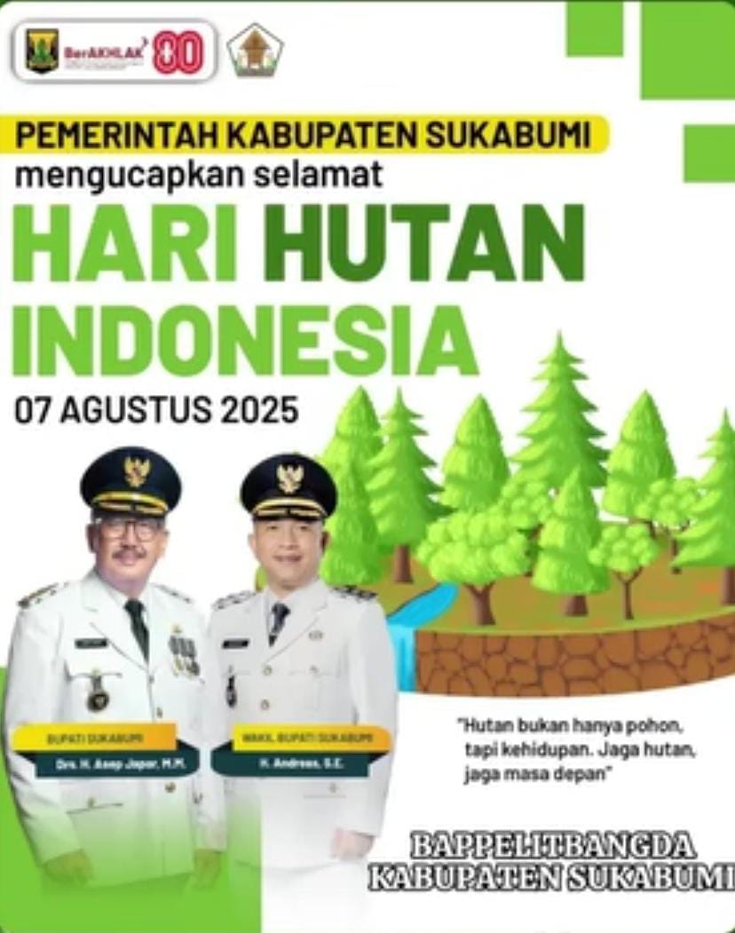 ARAHBICARA.COM – Badan Perencanaan Pembangunan, Penelitian, dan Pengembangan Daerah (Bappelitbangda) Kabupaten Sukabumi mengucapkan Selamat Hari Hutan Indonesia 07 Agustus 2025.