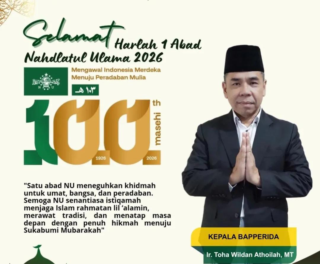 ARAHBICARA.COM – Badan Perencanaan Pembangunan Riset dan Inovasi Daerah (Bapperida) Kabupaten Sukabumi turut memeriahkan momentum Hari Lahir (Harlah) 1 Abad Nahdlatul Ulama (NU) Tahun 2026 dengan menyampaikan ucapan selamat sekaligus doa bagi kemajuan organisasi Islam terbesar di Indonesia tersebut.