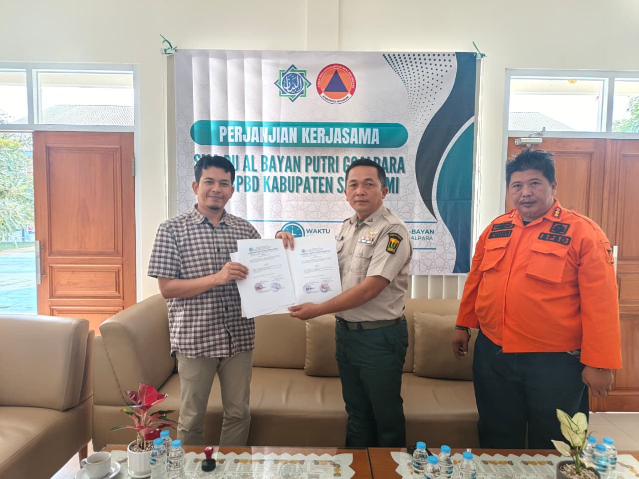 Kepala BPBD Sukabumi, Deden Sumpena, hadir langsung menandatangani dokumen kerja sama bersama Kepala Sekolah SMA PU Al Bayan Putri. Tujuannya, agar siswa dan guru lebih siap menghadapi potensi bencana serta memahami langkah-langkah evakuasi dan mitigasi.