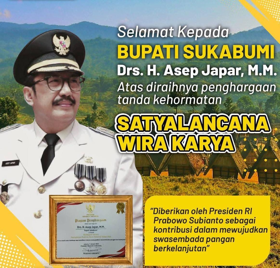 ARAHBICARA.COM – Kabupaten Sukabumi kembali menorehkan prestasi. Bupati Sukabumi Drs. H. Asep Japar menerima penghargaan Satyalancana Wirakarya dari Presiden RI Prabowo Subianto atas kontribusinya dalam mewujudkan swasembada pangan berkelanjutan.