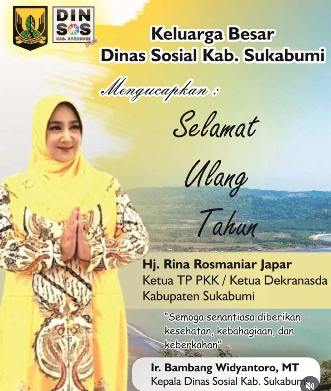 Kepala Dinsos Kabupaten Sukabumi, Ir. Bambang Widyantoro, MT, menyampaikan doa dan harapan terbaik bagi Hj. Rina. “Kami segenap keluarga besar Dinas Sosial Kabupaten Sukabumi mengucapkan selamat ulang tahun kepada Ibu Hj. Rina Rosmaniar Japar. Beliau adalah sosok inspiratif yang senantiasa mendukung langkah kami dalam melayani masyarakat. Semoga di usia yang baru ini, beliau senantiasa diberikan kesehatan yang prima, kebahagiaan lahir batin, serta keberkahan dalam menjalankan amanah demi kemajuan Kabupaten Sukabumi yang lebih baik lagi,” ujar Bambang, Jumat (24/4/2026).