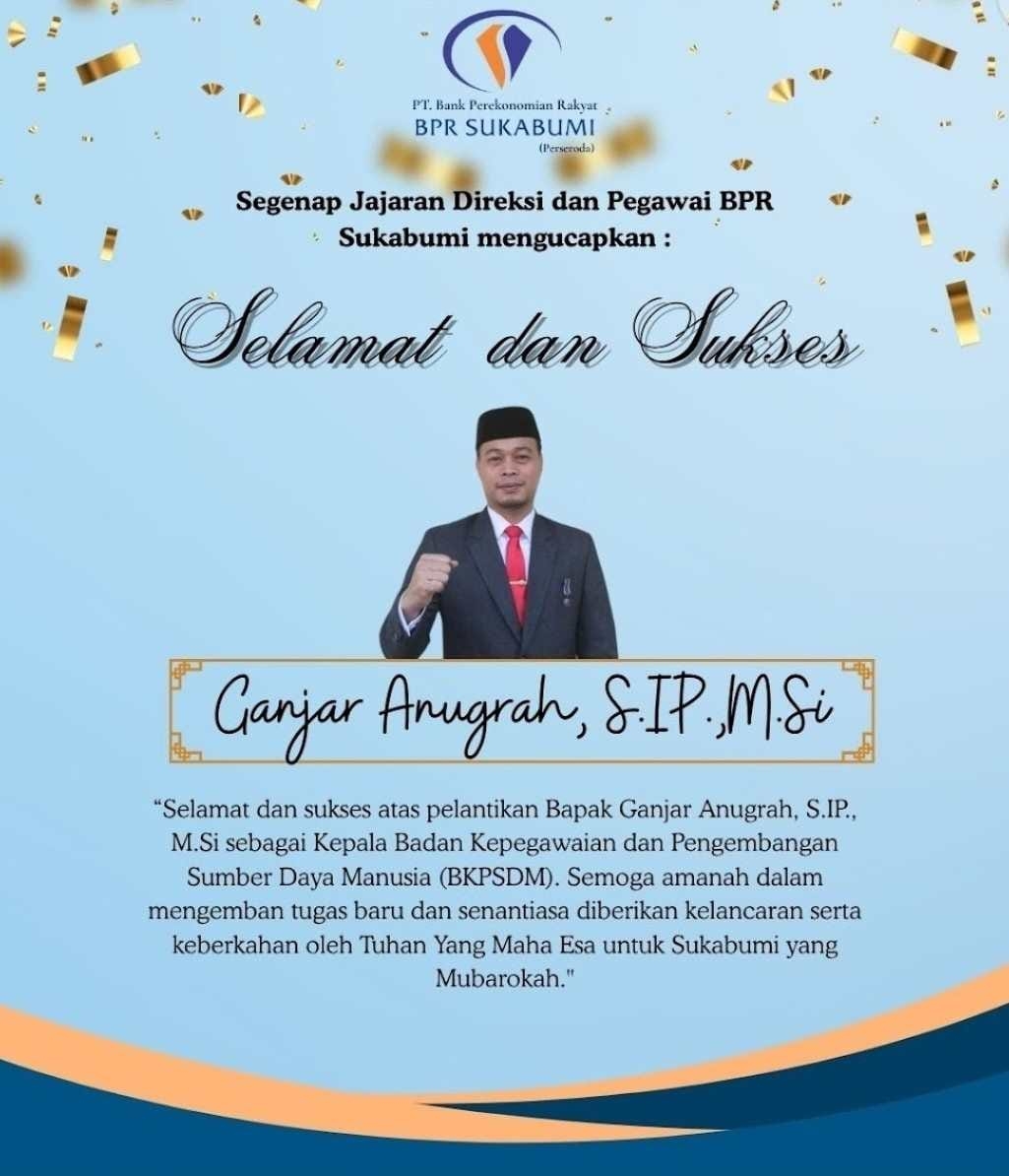 “Kami atas nama manajemen Perumda BPR Sukabumi mengucapkan selamat mengemban amanah baru kepada Bapak Ganjar Anugrah. Kami percaya, di bawah kepemimpinan beliau, pengembangan SDM di Kabupaten Sukabumi akan semakin progresif dan profesional,” ujar Eka Jatnika.