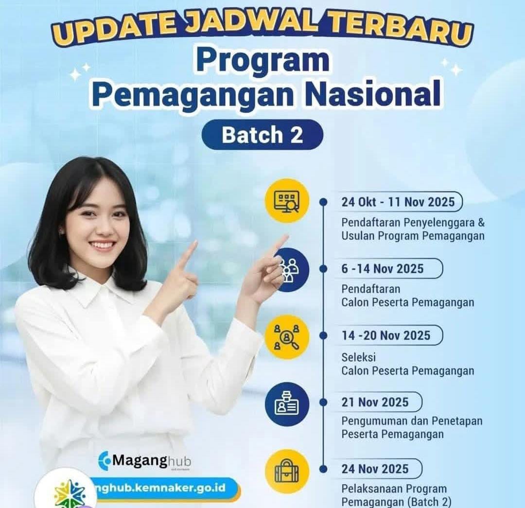 Berdasarkan jadwal resmi yang dirilis Kementerian Ketenagakerjaan, tahapan seleksi calon peserta pemagangan akan berlangsung pada 8-14 November 2025, kemudian pengumuman dan penetapan peserta dilakukan pada 21 November 2025, dan pelaksanaan program magang Batch 2 dimulai 24 November 2025.