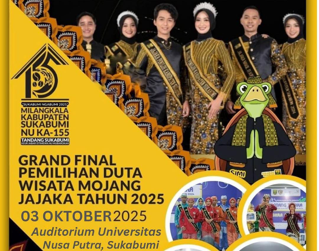 ARAHBICARA.COM – Malam puncak yang paling ditunggu-tunggu dalam dunia pariwisata Kabupaten Sukabumi akhirnya segera tiba. Pemerintah Kabupaten Sukabumi melalui Dinas Pariwisata akan menggelar Grand Final Pemilihan Duta Wisata Mojang Jajaka (Moka) Kabupaten Sukabumi Tahun 2025, pada Jumat (3/10/2025) di Auditorium Universitas Nusa Putra, Kecamatan Cisaat, Sukabumi.