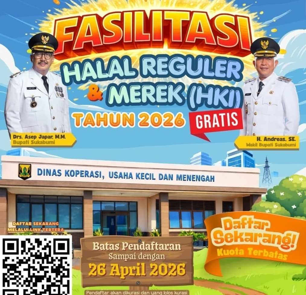 ARAHBICARA.COM – Dinas Koperasi, Usaha Kecil dan Menengah (DKUKM) Kabupaten Sukabumi kembali membuka program sertifikasi halal reguler dan pendaftaran merek (HKI) gratis untuk pelaku UMKM. Program ini berlangsung hingga 26 April 2026 dengan kuota terbatas dan seleksi peserta.