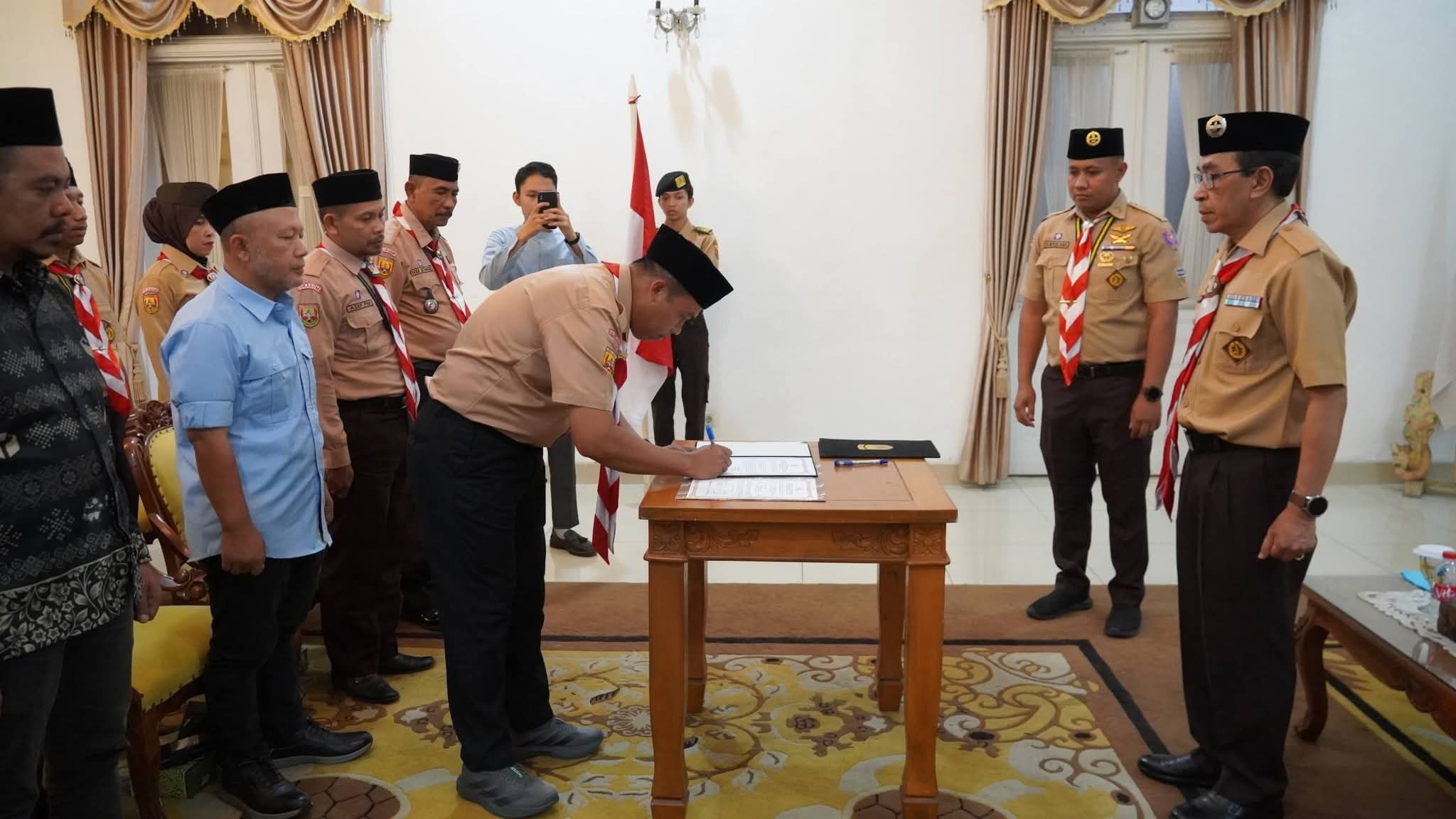 ARAHBICARA.COM – Ketua Kwartir Cabang (Kwarcab) Kabupaten Sukabumi, Ka H. Ade Suryaman, melantik Pengurus Majelis Pembimbing Satuan Karya (Mabisaka) dan Pimpinan Satuan Karya (Pinsaka) Adhyasta Pemilu. Pelantikan sekaligus penandatanganan nota kesepahaman dengan Bawaslu Kabupaten Sukabumi digelar di Pendopo Sukabumi, Jumat (5/12/2025).