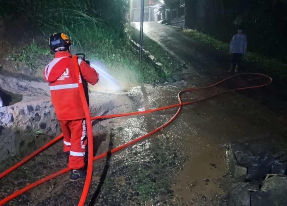 Tim Pusdalops Regu 1 BPBD membawa kendaraan operasional, chainsaw, dan pompa air untuk penanganan. Mereka melakukan pembersihan material longsor, normalisasi aliran air, serta pendataan dampak kejadian.