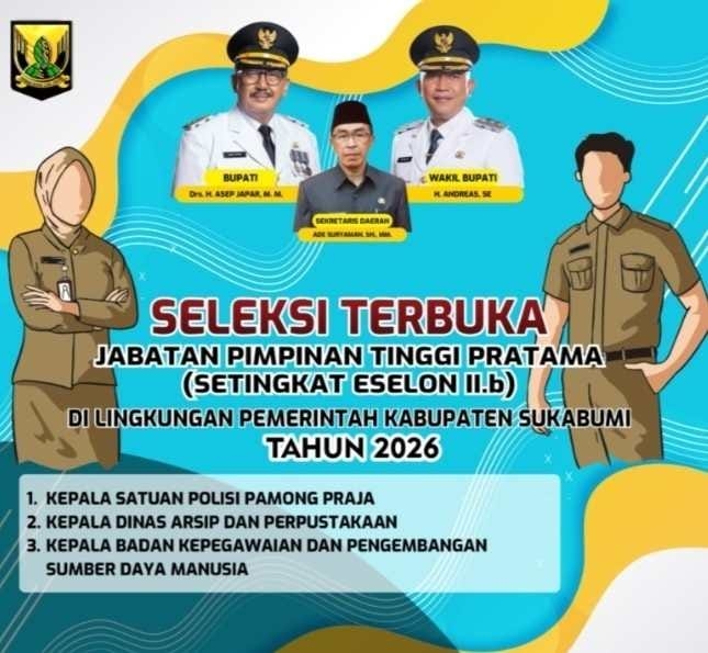 ARAHBICARA.COM – Panitia Seleksi Terbuka Jabatan Pimpinan Tinggi Pratama (JPTP) Pemerintah Kabupaten Sukabumi resmi mengumumkan hasil verifikasi dan validasi seleksi administrasi, Rabu (18/2/2026). Pengumuman ini menjadi tahap awal dalam pengisian tiga posisi strategis di lingkungan Pemkab Sukabumi.