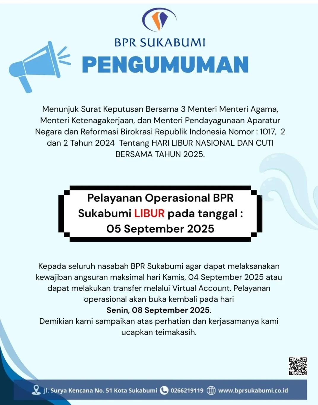 ARAHBICARA.COM – Bank Perkreditan Rakyat (BPR) Sukabumi mengumumkan bahwa pelayanan operasional akan libur pada Jumat, 5 September 2025.