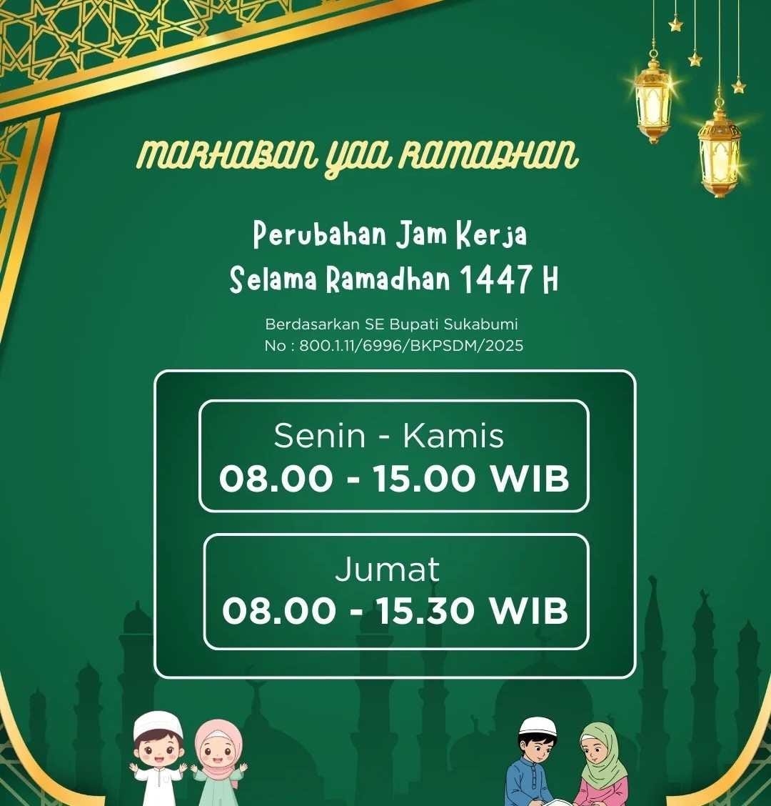 ARAHBICARA.COM – Dinas Pemberdayaan Perempuan dan Perlindungan Anak (DP3A) Kabupaten Sukabumi resmi memberlakukan penyesuaian jam kerja bagi Aparatur Sipil Negara (ASN) selama bulan suci Ramadan 1447 Hijriah. Kebijakan ini merujuk pada Surat Edaran Bupati Sukabumi Nomor: 800.1.11/6996/BKPSDM/2025.