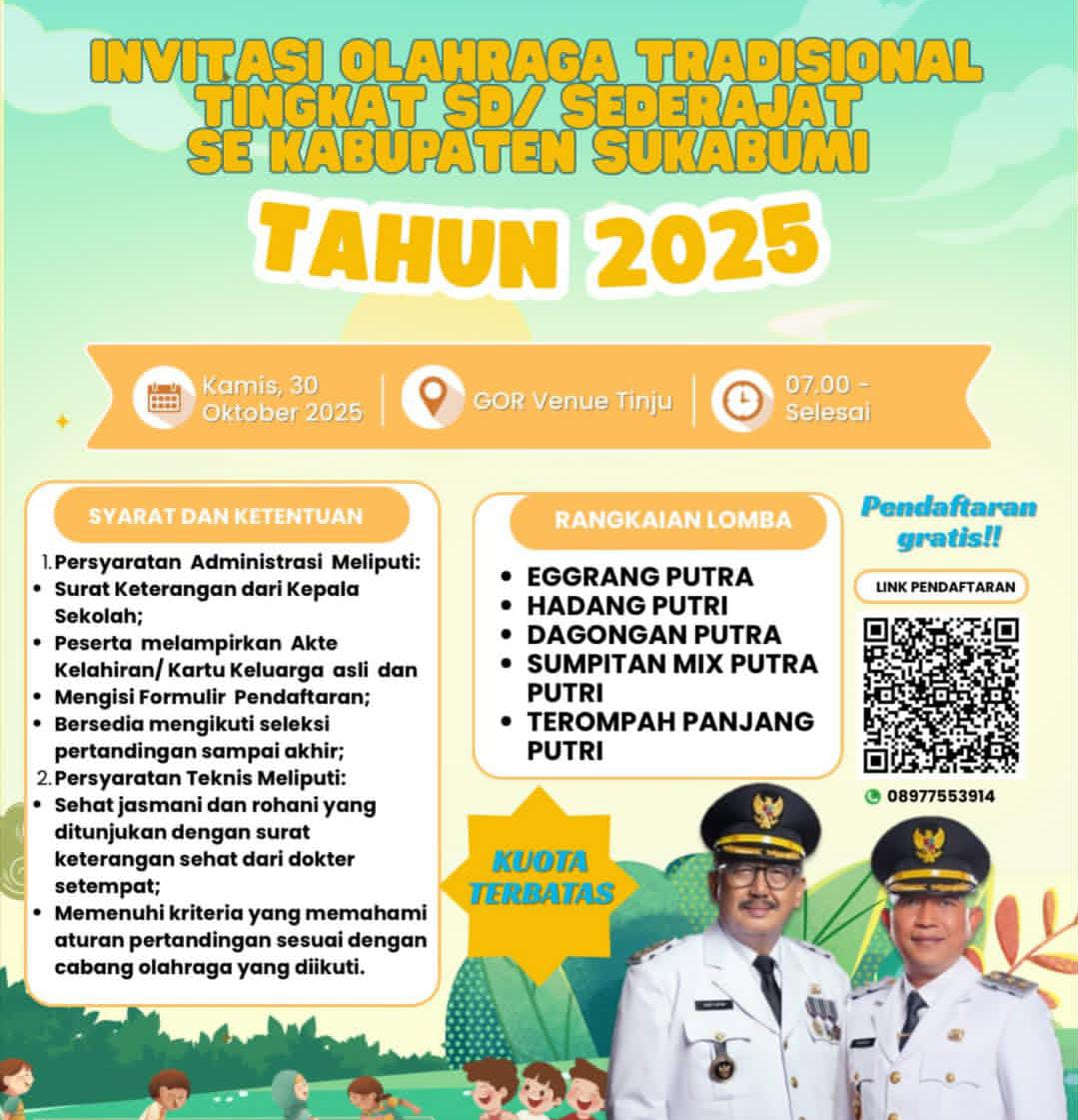 ARAHBICARA.COM – Guna melestarikan budaya bangsa sekaligus menumbuhkan semangat sportivitas dan kebersamaan sejak usia dini, Dinas Kebudayaan, Kepemudaan, dan Olahraga (Disbudpora) Kabupaten Sukabumi melalui Bidang Olahraga menggelar Lomba Invitasi Olahraga Tradisional tingkat SD/sederajat se-Kabupaten Sukabumi tahun 2025.
