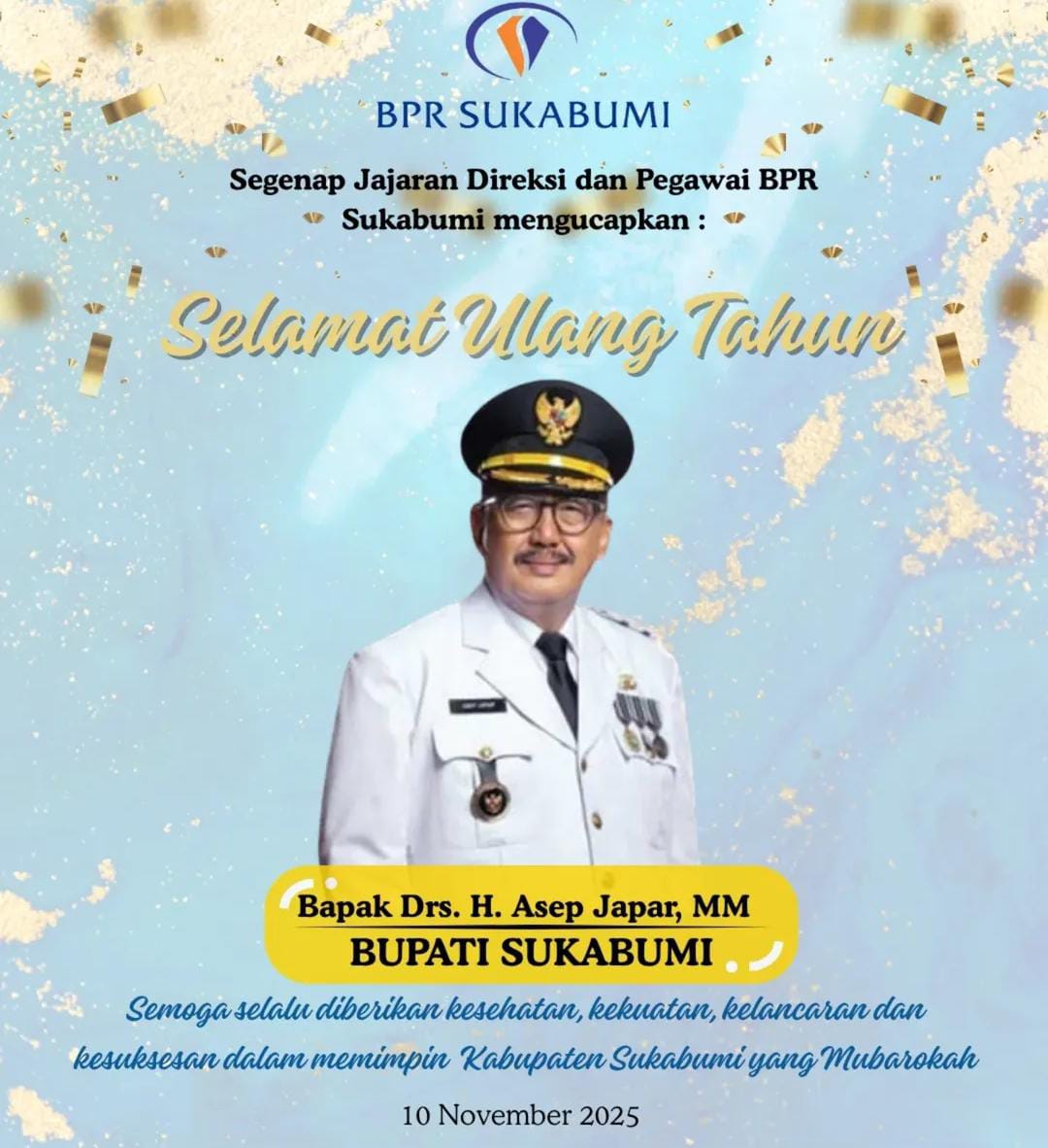 “Kami segenap jajaran Perumda BPR Sukabumi mengucapkan selamat ulang tahun kepada Bapak Bupati Sukabumi, Drs. H. Asep Japar, M.M. Semoga beliau senantiasa diberikan kesehatan, kekuatan, dan keberkahan dalam melanjutkan pengabdian kepada masyarakat Sukabumi,” ujar Udung, Senin (10/11/2025).